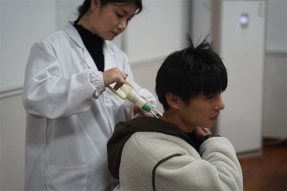長期伏案工作容易導致頸椎病、關(guān)節(jié)炎、肩周炎等慢性疾病,這也是許多教職工面臨的健康困擾。針對這一問題,志愿者為教職工們提供了中醫(yī)理療、針灸、推拿、拔罐、艾灸、刮痧等多種治療服務(wù)。
